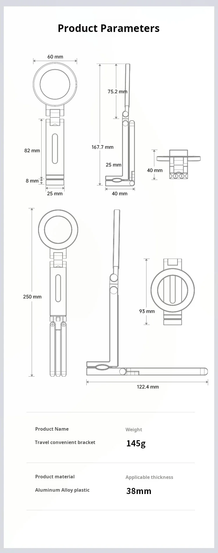 Clip Range: 38mm (fits 4-8" phones)