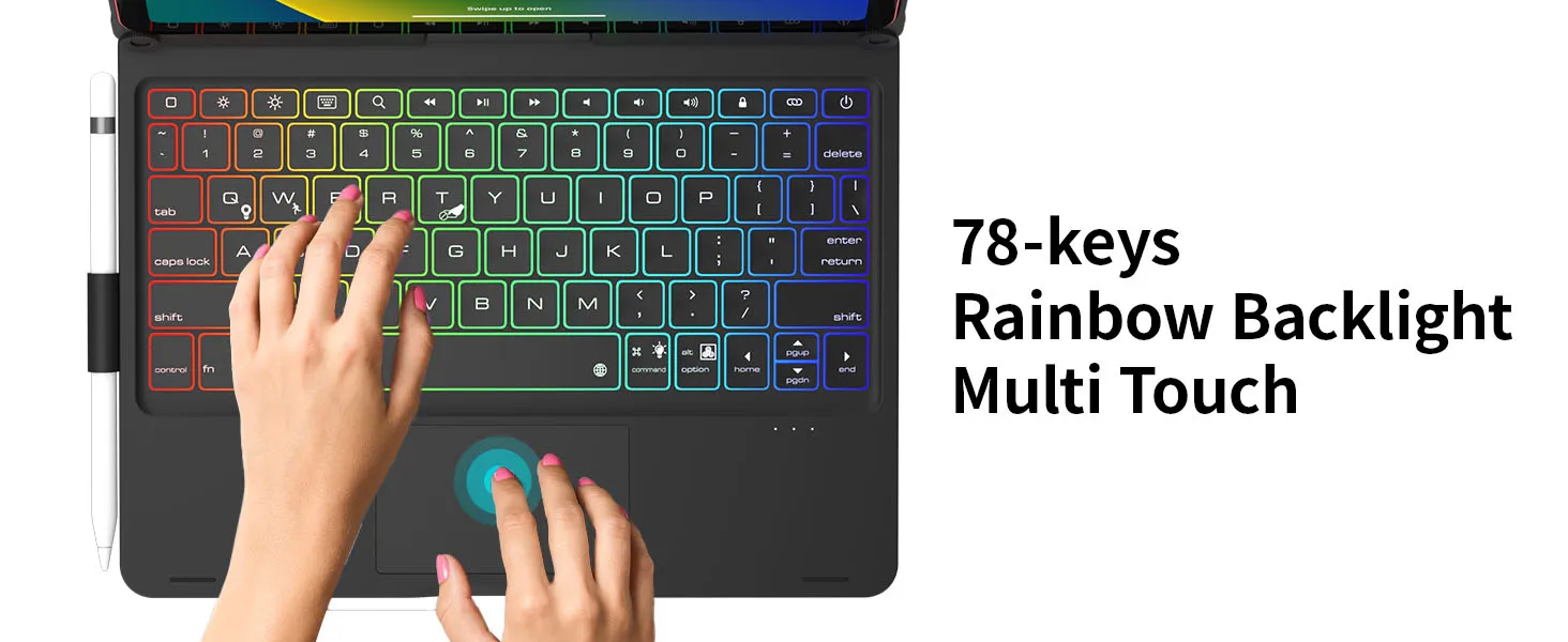 Type quickly and accurately on a laptop-like keyboard with a full row of iPadOS shortcuts and laser-etched keys that allow an adjustable 10-color RGB LED backlight to shine through.