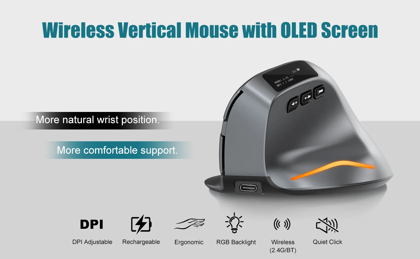 The vertical mouse design, coupled with an 8-button layout, offers ergonomic comfort for extended use.