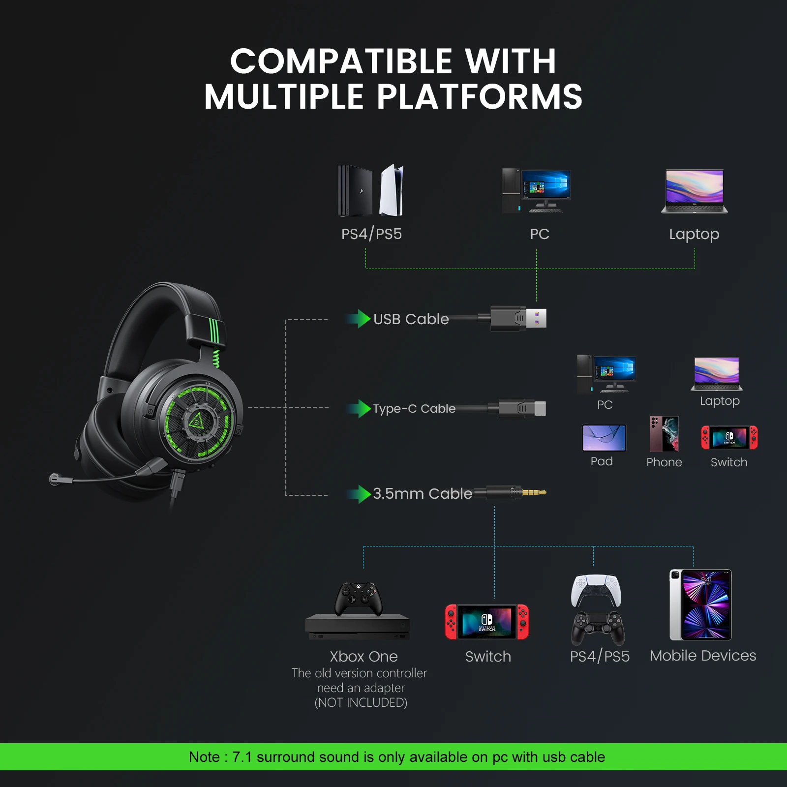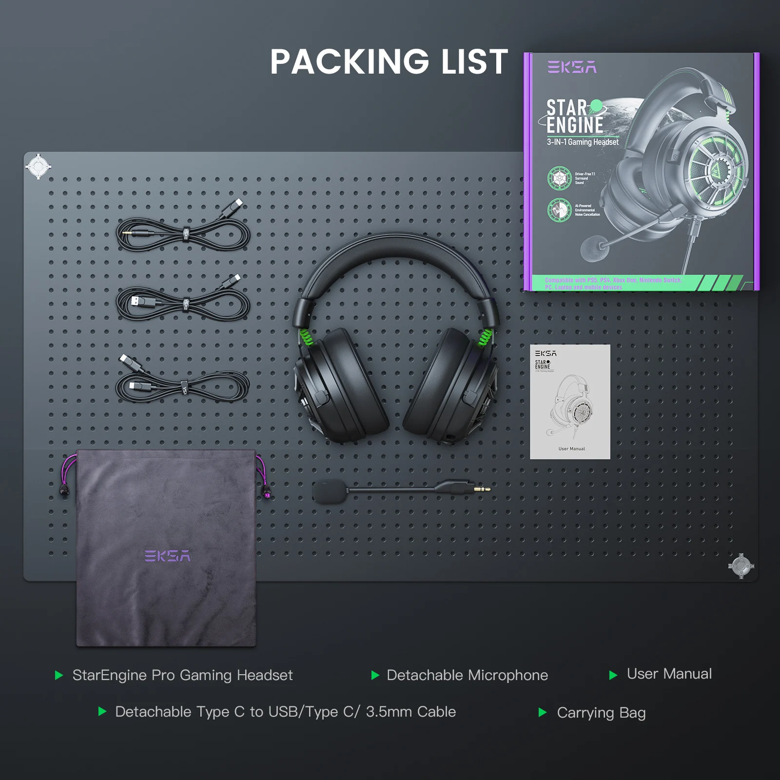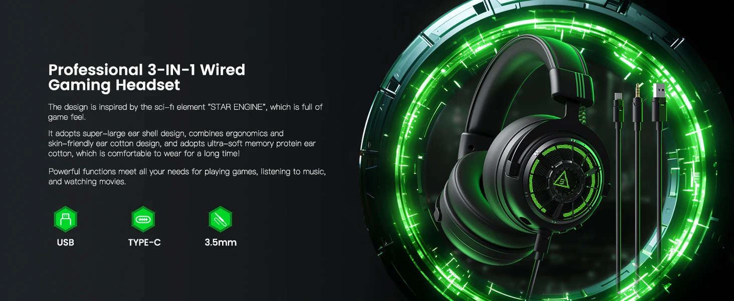 EKSA Star Engine Pro Gaming Headset is equipped with 3.5mm, USB C, USB A three audio interfaces, suitable for all games and mobile devices. Compatible with PC, PS4, PS5, Xbox one, Switch, Computer, Laptop, Phone.