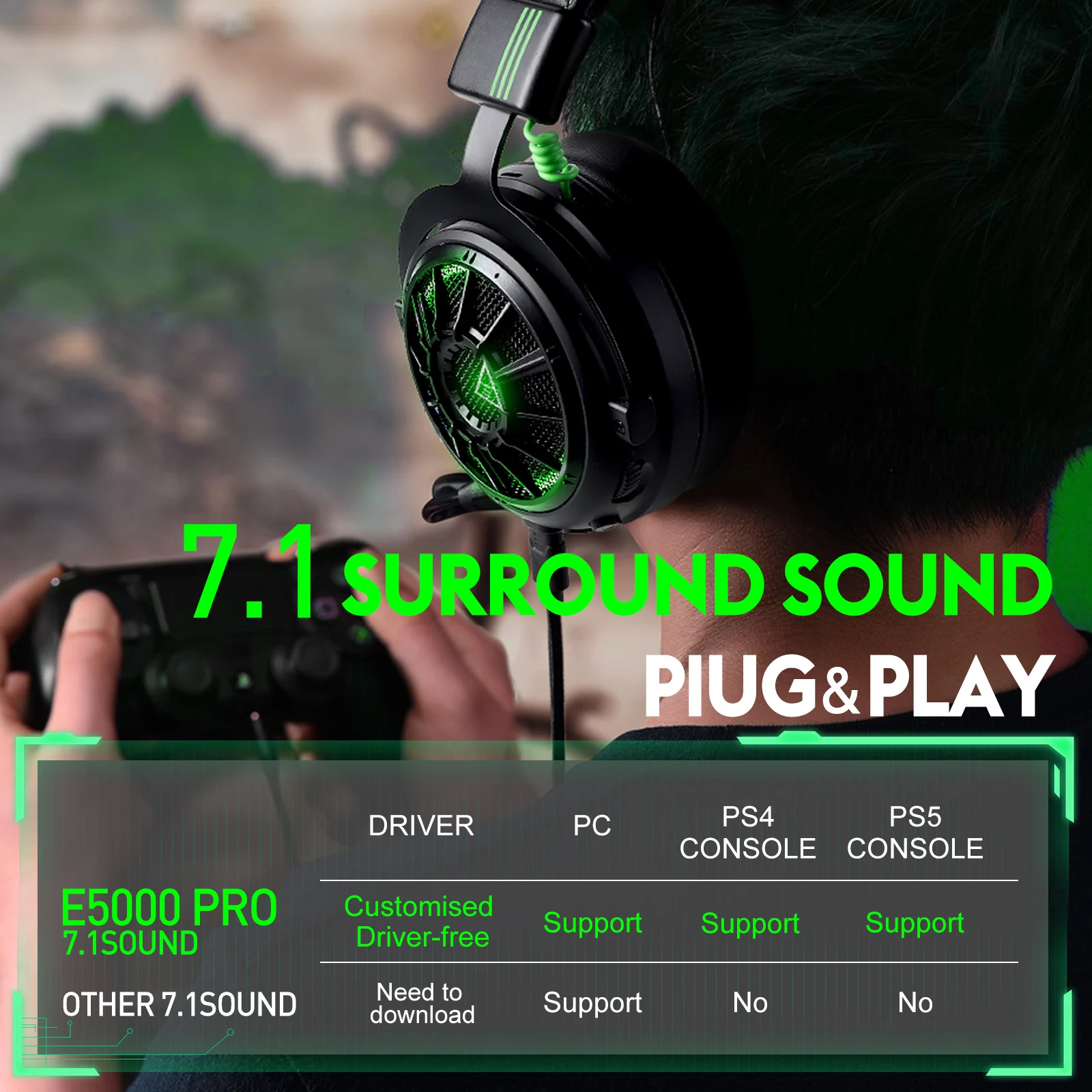 E5000 Pro has built-in 7.1 surround sound effects. At the same time, in order to meet the needs of professional gamers, you can download the 7.1 surround sound driver from our official website, and you can adjust the EQ according to your own preferences.